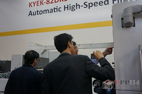 “我們這次展出的就只有這一臺產品,整個機身包括飛達、除粉、主機、分切、收紙等部分,設計比較緊湊,但功能齊全,采用的技術是鏈刀覆膜,不會有任何尾膜產生。”姜俊宇先生介紹說,“此外,這臺設備的界面也很人性化,它配有多種語言選擇,一個人即可操作所有生產流程,機器的任何一個門打開,操控屏幕上都會有警示。”