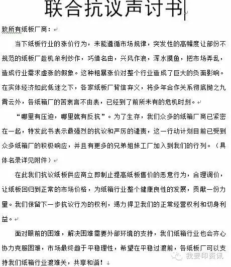 吉林省包裝技術(shù)協(xié)會(huì)、東北包裝企業(yè)聯(lián)盟11月30日聯(lián)合發(fā)出《通告》,嚴(yán)厲批評(píng)“部分無(wú)良紙廠”,稱其“為一己私利,毫無(wú)信義,絲毫不顧及多年的合作感情,巧借名目、惡意炒作、趁火打劫、牟取暴利,不停地發(fā)函漲價(jià),導(dǎo)致很多二、三級(jí)廠甚至已經(jīng)無(wú)法與終端客戶議價(jià)、接單。”