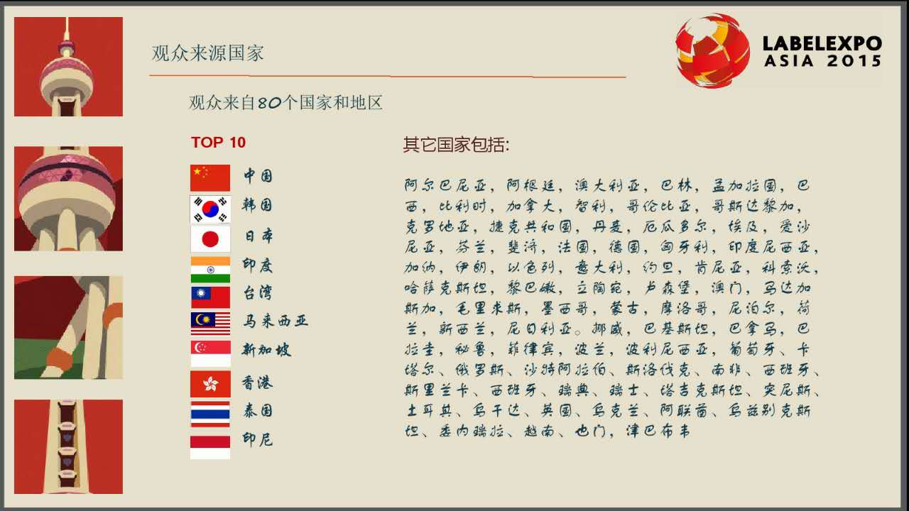 Labelexpo Asia作為亞洲地區展出規模最大、也是最具影響力的標簽、包裝印刷展覽會,其國際化也可以從2015年展會的觀眾統計數據中略見一斑:觀眾來自80個國家和地區(見圖3)。排在前10名的國家包括:中國、韓國、日本、印度、中國臺灣省、馬來西亞、新加坡、香港、泰國和印度尼西亞。
