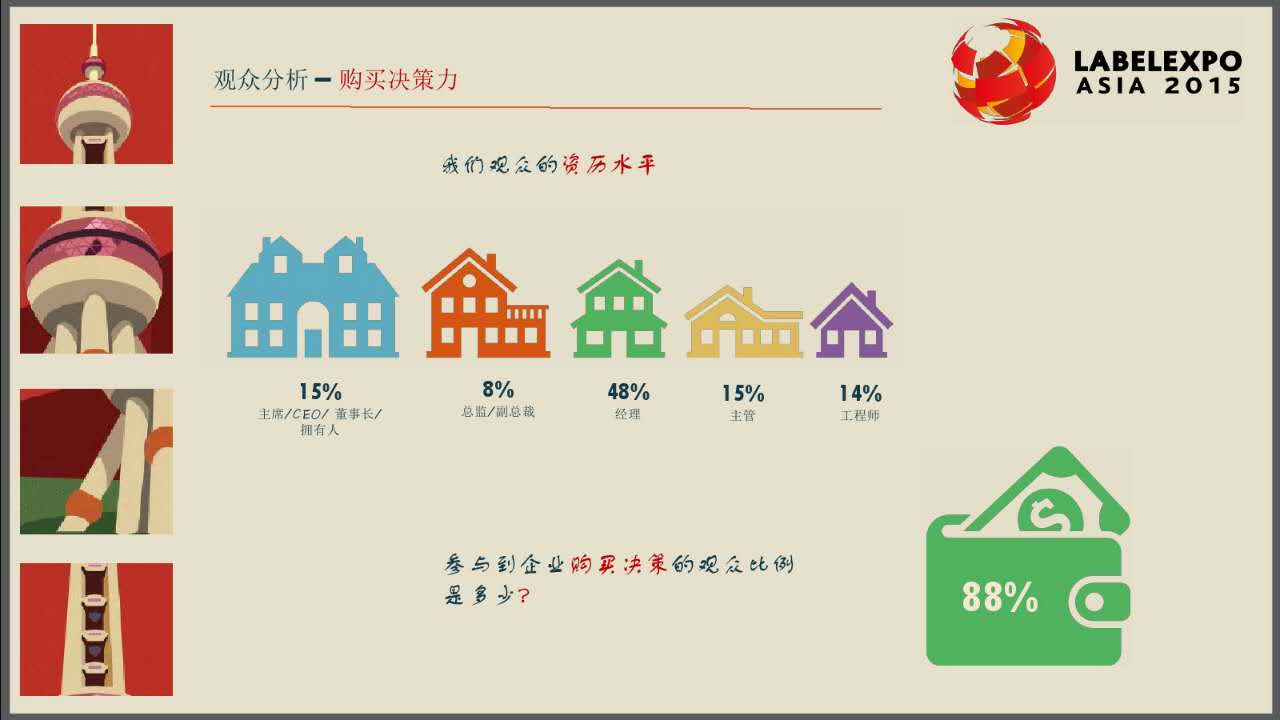 優(yōu)質(zhì)的參展商、優(yōu)質(zhì)的展品,吸引了優(yōu)質(zhì)的參觀者。根據(jù)統(tǒng)計,亞洲國際標(biāo)簽印刷展覽會有88%以上的觀眾會參與到企業(yè)的購買決策中(見圖6),包括企業(yè)的CEO、所有人、董事長、總裁、主管和工程師等。他們的參與使得對展會的銷售起到實質(zhì)性的推動作用。