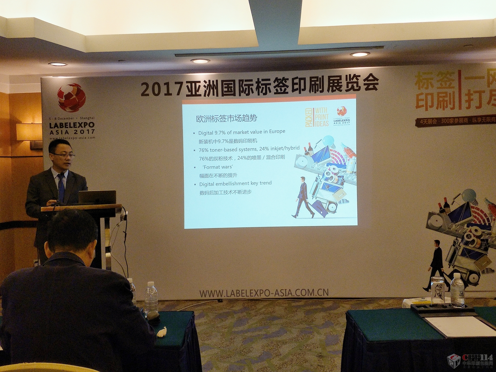 會上,亞洲國際標簽印刷展覽會中國區總監劉濤代表展會主辦方以《變革中的標簽世界》為題,詳細介紹了全球標簽、包裝印刷領域內的發展趨勢。他表示:盡管受到電子媒體和網絡購物的沖擊,但根據AWA的市場研究發現,全球標簽市場需求量仍以年均3.9%的速度增長,略高于全球的GDP增長速度。特別是在一些新興市場上,標簽擁有巨大的商業潛力,因為這類市場上的消費者正在向購買更多貼有標簽的產品的方向發展。在全球范圍內,亞洲標簽印刷市場所占份額最大,達到43%,接下來分別是歐洲25%、美洲19%、南美洲9%、非洲和中東地區4%。而在亞洲地區,得益于年輕的人口結構和旺盛的消費需求,以及中印工協近年來不懈的努力推動,中國標簽印刷市場所占比例最大,甚至超過亞洲市場的一半之多,達到55%。
