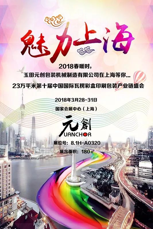 玉田元創包裝機械制造有限公司將于2018年3月28-31日精彩亮相第十屆中國瓦楞彩盒數字包裝印刷展覽會。(展位號: 8.1H-A0320  )。屆時,玉田元創將攜全新產品,帶給觀眾不一樣的視覺盛宴!