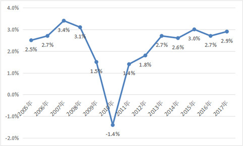 下面這組數據,以前曾用過:2005-2017年,美國印刷企業平均凈利潤率的高點為3.4%,低點為-1.4%,最近5年則在2.6%-3.0%的區間內小幅波動,走勢平穩。