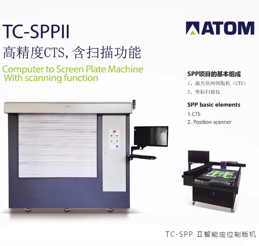 與TC-1300CTS配套的TC-SPP Ⅱ智能定位制版機,包括定位系統及絲網激光制版系統兩部分,旨在解決生產工藝中很難以克服的絲印與膠印套印不準問題。首先,它對印刷品的實際變形情況進行掃描,后以專用軟件系統控制激光絲網制版機使其按實際變化轉版,令膠印和絲印工藝實現完美套印。