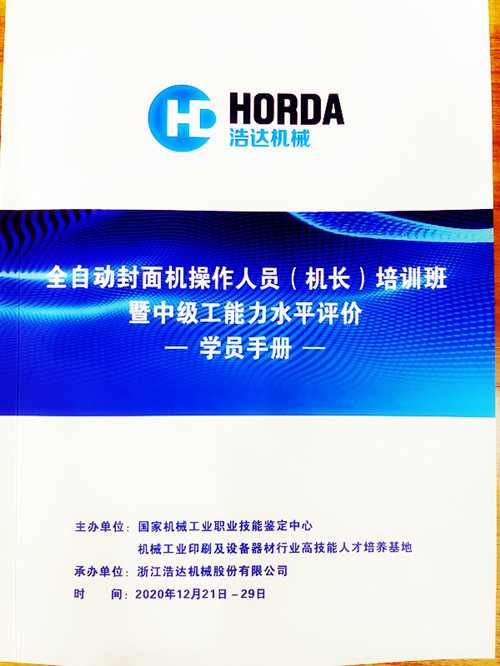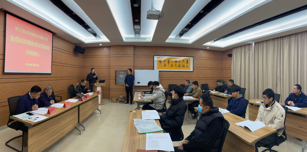 - 2020年12月22日,中國首期“全自動封面機操作人員(機長)培訓班”在浙江浩達機械股份有限公司(以下簡稱浩達機械)舉行開班典禮。溫州技師學院虞學聰老師、浩達機械副總經理林朝梁、副總經理葉芳、技術部經理朱聘臣、售后部經理沙劍棟等參加了本次開班儀式,并紛紛發表寄語。