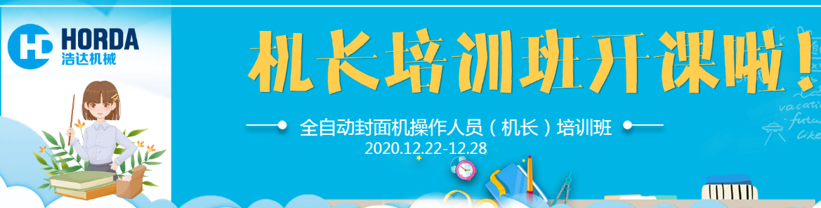 - 2020年12月22日,中國首期“全自動封面機操作人員(機長)培訓班”在浙江浩達機械股份有限公司(以下簡稱浩達機械)舉行開班典禮。溫州技師學院虞學聰老師、浩達機械副總經理林朝梁、副總經理葉芳、技術部經理朱聘臣、售后部經理沙劍棟等參加了本次開班儀式,并紛紛發表寄語。
