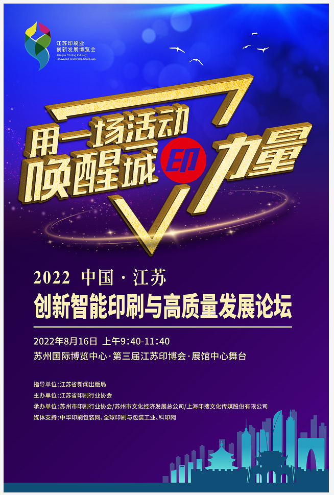 - 創新智能印刷如何高速發展?如何引領江蘇印包產業新發展?如何促進印刷包裝企業朝著高質量方向發展?2022年8月16日,江蘇創新智能印刷與高質量發展論壇將為您一一解答。