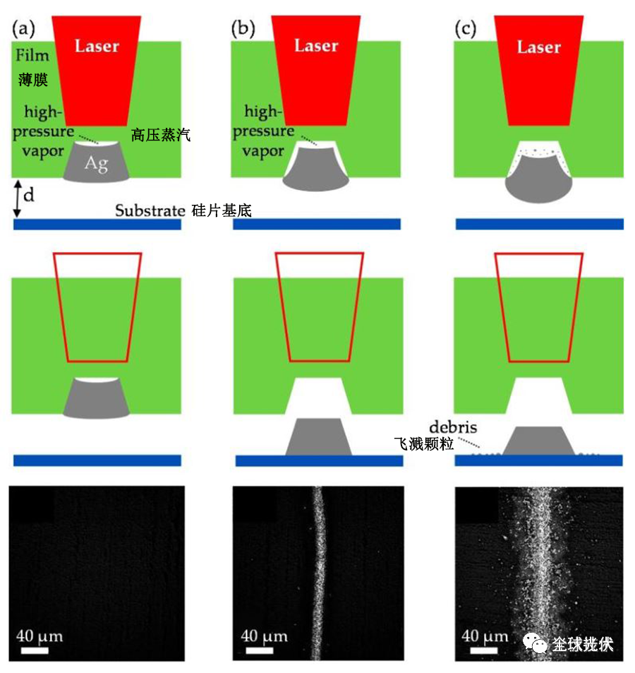 同時將基板安裝在移動的卡盤上,并以200um的距離放置在薄膜下方,一個接一個的用波長為1070nm的激光照射,發射激光輻照度通過透明膜,其能量首先被漿料表面吸收,產生的熱能使漿料和溝槽之間的界面區域中的有機成分氣化,并在漿料/薄膜界面處形成高壓蒸汽層,當在漿料/薄膜界面處建立足夠的壓力時,漿料會釋放到基材表面上。