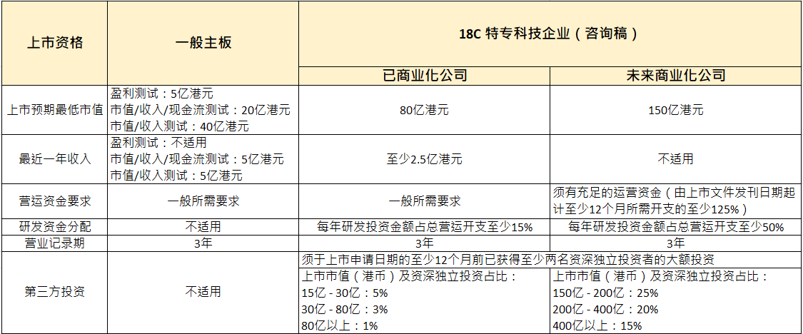 港交所上月發布有關特專科技企業上市制度的咨詢文件第18C章,建議降低硬其營業收入要求,允許沒有營業收入的相關企業來港上市募資;目前符合要求的五大科技領域包括:新一代信息技術、先進硬件和材料、新能源和節能環保,以及新食品和農業技術,并分類成已商業化及未商業化,要求申請科企市值最少達80億和150億港元。