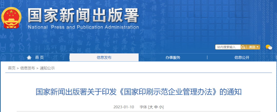 - 1月10日,國家新聞出版署官網發布《國家印刷示范企業管理辦法》,2011年12月6日新聞出版總署印發的《國家印刷復制示范企業管理辦法》同時廢止。