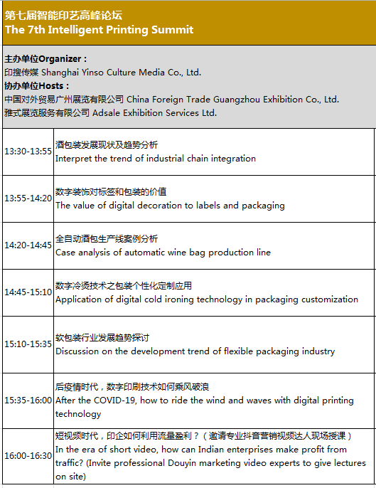 【CPP114】訊:由上海印搜文化傳媒股份有限公司、中華印刷包裝網主辦,中國對外貿易廣州展覽有限公司、雅式展覽服務有限公司協辦的“第七屆智能印藝高峰論壇”將于3月3日下午在廣州|中國進出口商品交易會展館A區會議室4舉辦。