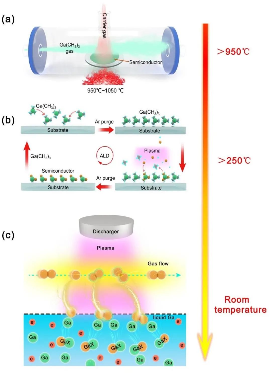 圖1 制造半導體的三類代表性方法的工作原理及溫度條件。(a)MOCVD法制造半導體,溫度在950℃~1050℃;(b)ALD法制造半導體,要求溫度高于250℃;(c) 氣體或等離子體介導的液態(tài)金屬鎵化學反應,用于室溫制造半導體,約25℃。