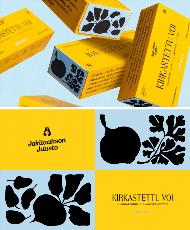 Jokilaakson Juusto是一家芬蘭家族企業,專門生產奶酪、涂抹醬和植物性產品。為了更新澄清黃油的包裝,品牌委托Studio Hellsten設計了一個全新的包裝系統。新包裝設計從法國烹飪和小酒館美學中汲取靈感,給人一種現代復古的感覺。淺藍色和明黃色的色調搭配強烈的小酒館風格插圖,創造出一個具有現代感的包裝系統,同時也營造出一種有趣的古樸美感。