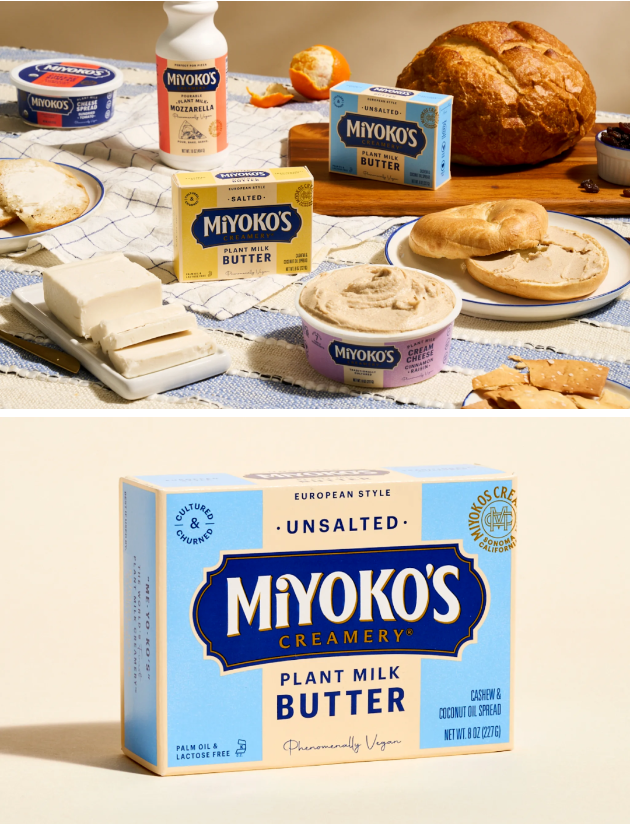 Miyoko Creamery's推出的植物基黃油和奶酪等系列產品,擁有經典溫馨的雜貨店外觀,很容易讓人將其與其所“模仿”的乳制品混淆,有老式的條紋包裝和可愛的漩渦襯線文字標志。據品牌介紹,其目標不是取代傳統的乳制品,而是作為一種烹飪替代品。Miyoko Creamery's為品牌重新灌輸了"手工制作"、"工匠精神"的吸引力。