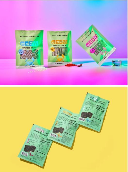 GEEM是一個初創的海藻零食品牌。Avidity Creative打破常規,為GEEM的海藻零食設計了多彩、有趣的包裝,有咸、辣、甜三種口味。從海藻本身的插圖細節到健康信息的排版以及時髦、厚重的文字標志,小袋的外觀都是波浪形的。每種口味都有不同的、易于識別的顏色。
