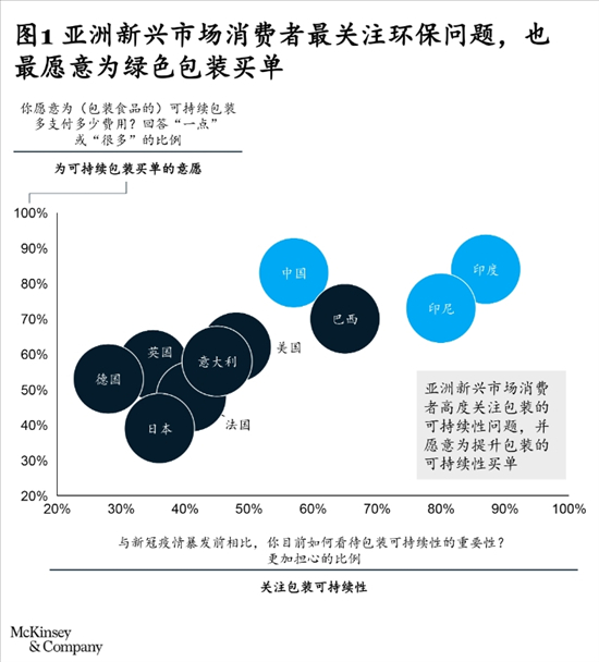 在消費者支付意愿上,我們也得到了類似結論:中國、印度和印尼的消費者購買“綠色包裝”食品的意愿,遠高于全球其他受訪國家(見圖1)。與此同時,巴西消費者也比其他國家消費者更愿意為綠色包裝買單。當然,很難說消費者的擔憂和支付意愿能否轉化為實際行動,但這至少表明這些市場的消費者環(huán)保意識相對較高,相關方需要有所行動。