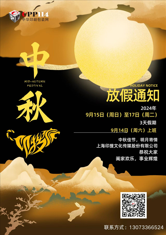 - 上海印搜文化傳媒股份有限公司(含旗下平臺(tái):中華印刷包裝網(wǎng)、印刷搜搜APP、文化創(chuàng)意商城)2024年中秋節(jié)放假日期安排如下:9月15日-9月17日放假調(diào)休,共3天。9月14日(星期六)上班。預(yù)祝各位同事及同仁中秋快樂、闔家幸福!