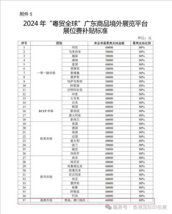 以2025年香港國際印刷及包裝展為例,預計2025參加該展的廣東企業(yè)(不包含深圳,深圳為計劃單列市,政策以深圳市商務局另行發(fā)布為準)參展面積在18平方米以下的,均可以獲得廣東省商務廳“粵貿(mào)全球”政策支持,補貼比例參照2024年政策的話,為不超過展位費用的80%。