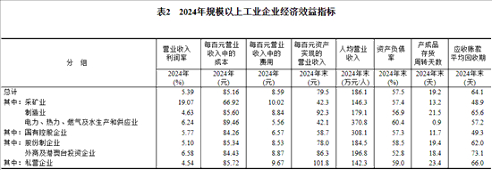 2024年末,規模以上工業企業每百元資產實現的營業收入為79.5元,比上年末減少2.7元;人均營業收入為186.1萬元,比上年末增加6.9萬元:產成品存貨周轉天數為19.2天,比上年末增加0.1天;應收賬款平均回收期為64.1天,比上年末增加3.9天。