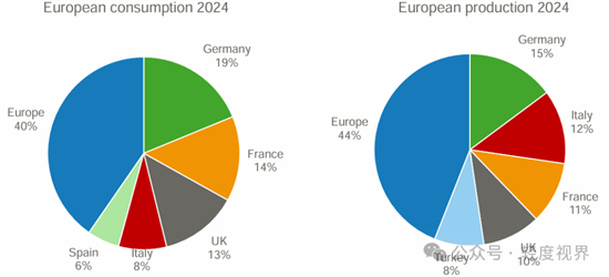 市場數據顯示,2023年歐洲軟包裝市場經歷了顯著下滑后,2024年開始恢復增長。從區域分布看,德國在消費量方面占19%,法國14%,英國13%;而在生產量方面,德國占15%,意大利12%,法國11%。
