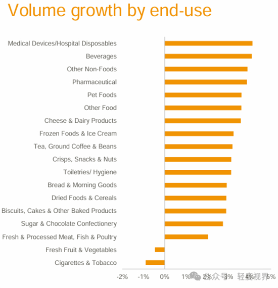 2024年軟包裝消費量增長強勁的領域包括醫(yī)療設備/醫(yī)院一次性用品、飲料、非食品、制藥和寵物食品,而香煙和煙草、新鮮水果和蔬菜類別則呈下降趨勢。