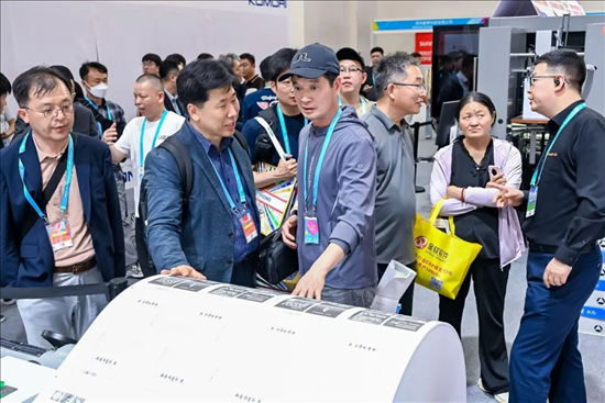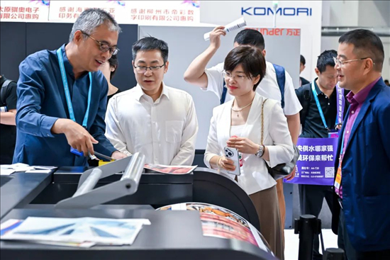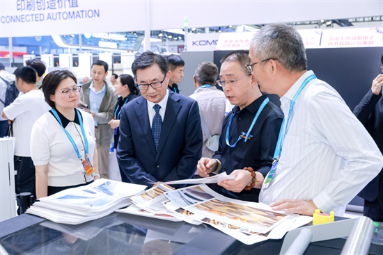▲中國機(jī)械工業(yè)聯(lián)合會黨委副書記薛一平、中國印刷及設(shè)備器材工業(yè)協(xié)會副理事長楊斌一行蒞臨展臺