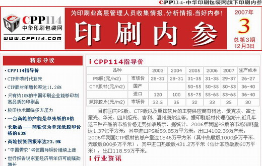 《印刷內參》是CPP114經過深入的市場調研與行情把握,數據與信息皆是來自結合當前市場發(fā)展概況的第一手資料,具有較強的參考價值!队∷葏ⅰ繁辛CPP114自建站以來就一貫堅持的“資訊先行”的工作方針與發(fā)展宗旨。在互聯(lián)網和電子商務肆行的現(xiàn)代,資訊,是任何一個企業(yè)存活的關鍵。《印刷內參》的推出,正是基于對印刷包裝行業(yè)所有企業(yè)的切實考慮,而我們鎖定的目標接受群體主要是對企業(yè)有著較大影響的中上管理階層。最新的信息資訊能夠讓企業(yè)的管理者對整個行業(yè)的全面把握有著清晰的認識,翔實權威的數據則可以幫助企業(yè)決策者在作決策時提供非常具有參考價值的數據參數。這些,是目前任何一家行業(yè)網站所無法比擬的,而我們的價值也正體現(xiàn)于此。